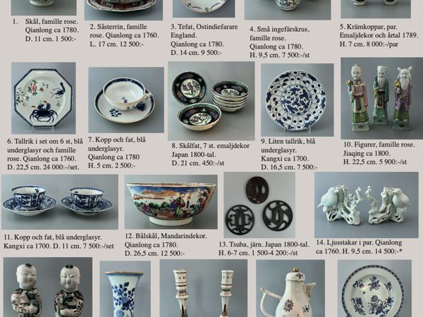 På vår hemsida presenterar vi delar av vårt sortiment, med primärt fokus på antikt kinesiskt porslin. Eftersom alla våra antikviteter är unika kan det hända att föremål som visas på vår hemsida blivit sålda. I så fall hjälper vi dig att hitta liknande föremål. Vi har fler antikviteter i lager än vad som visas här, om du söker ett speciellt föremål är du varmt välkommen att kontakta oss!