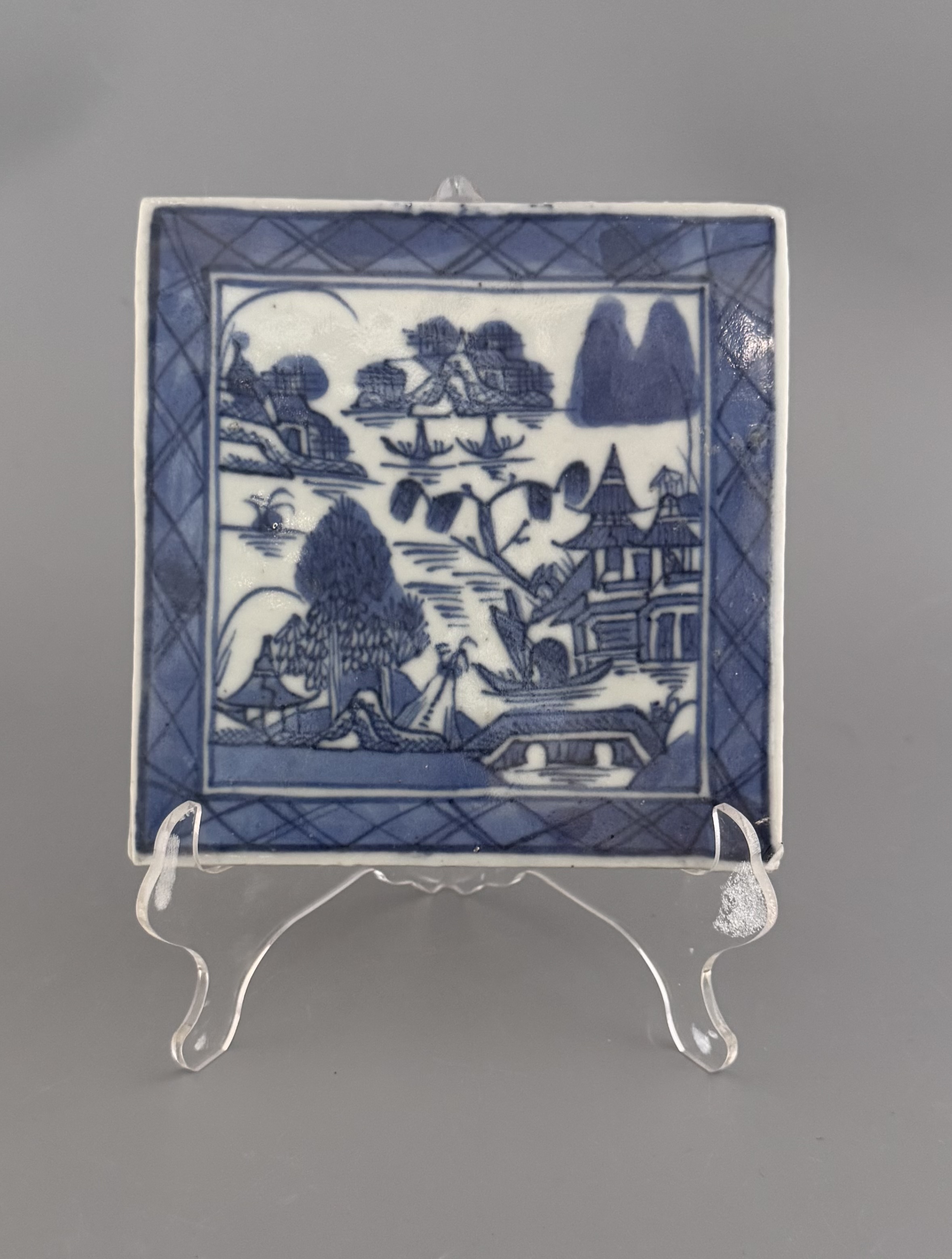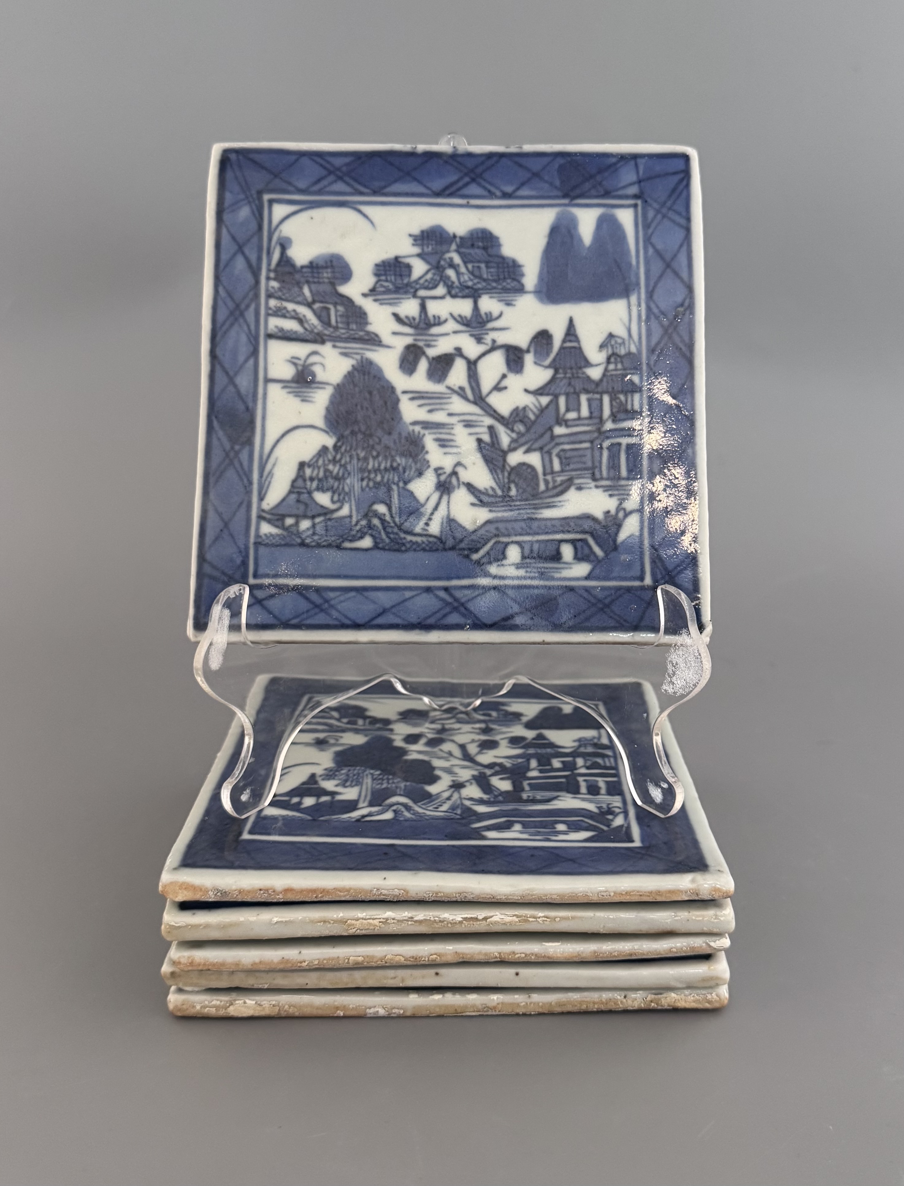 Vackra kakelplattor 12,5x12,5 cm med blå underglasyr, motiv av flodlandskap och pagoder. Charmiga att använda som underlägg till flaskor eller grytor på bordet eller varför inte kakla in i ett badrum eller vid spisen?