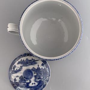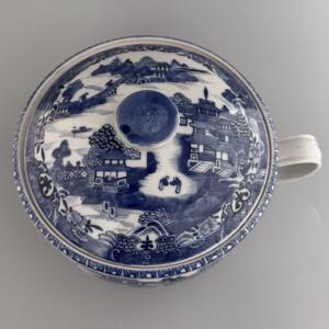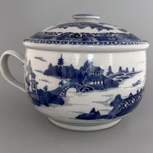 Potta med lock, blå underglasyr och motiv av pagod och flodlandskap.