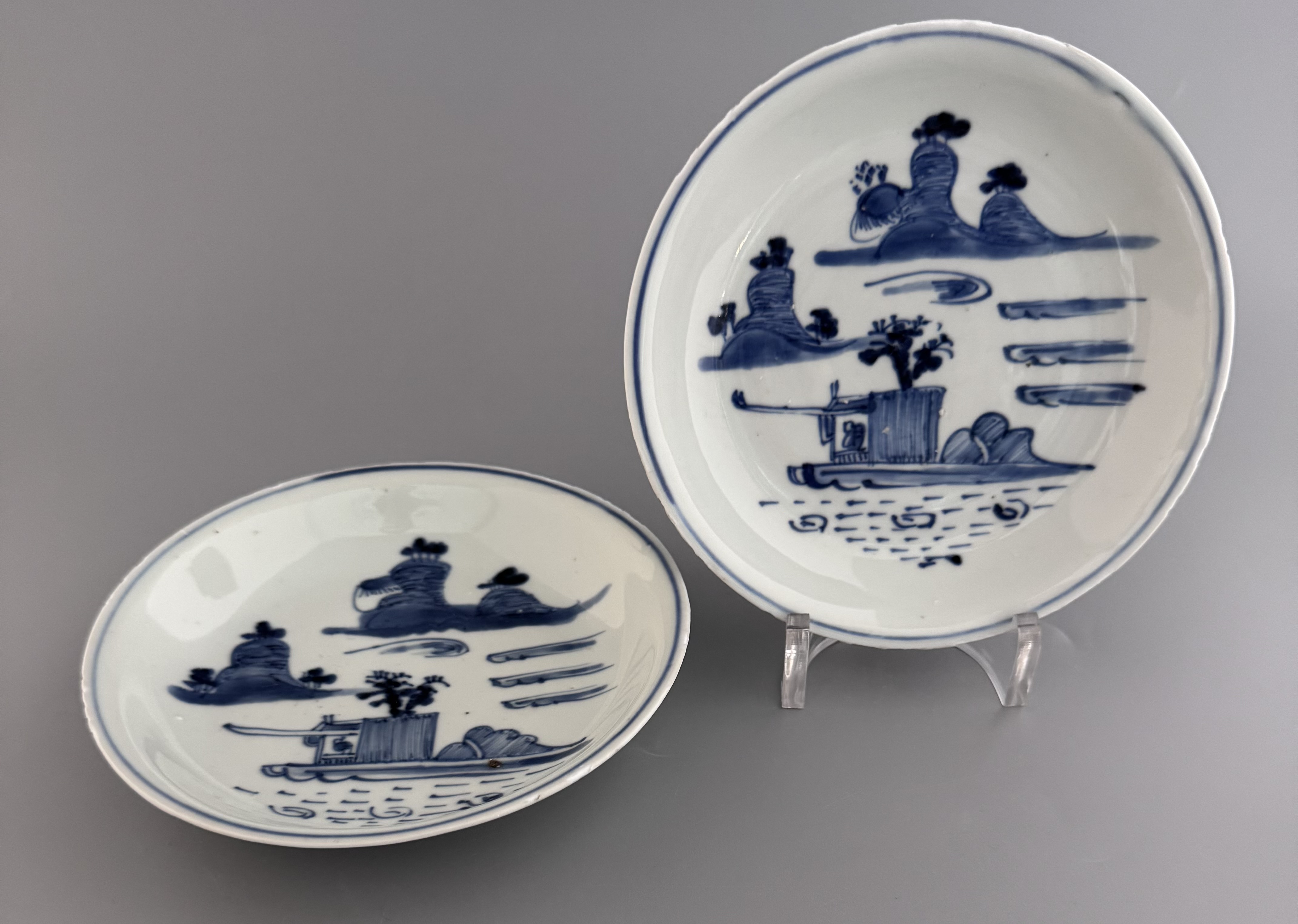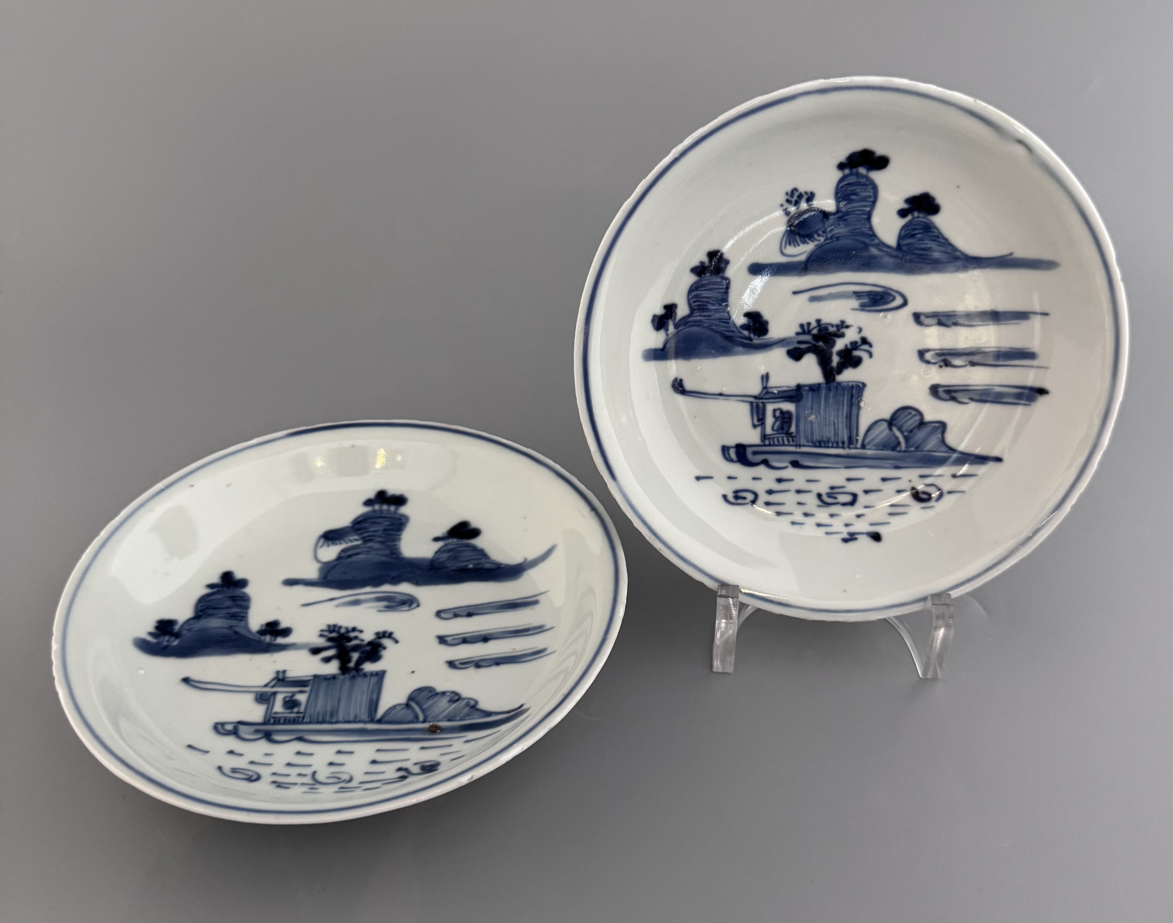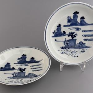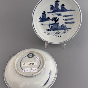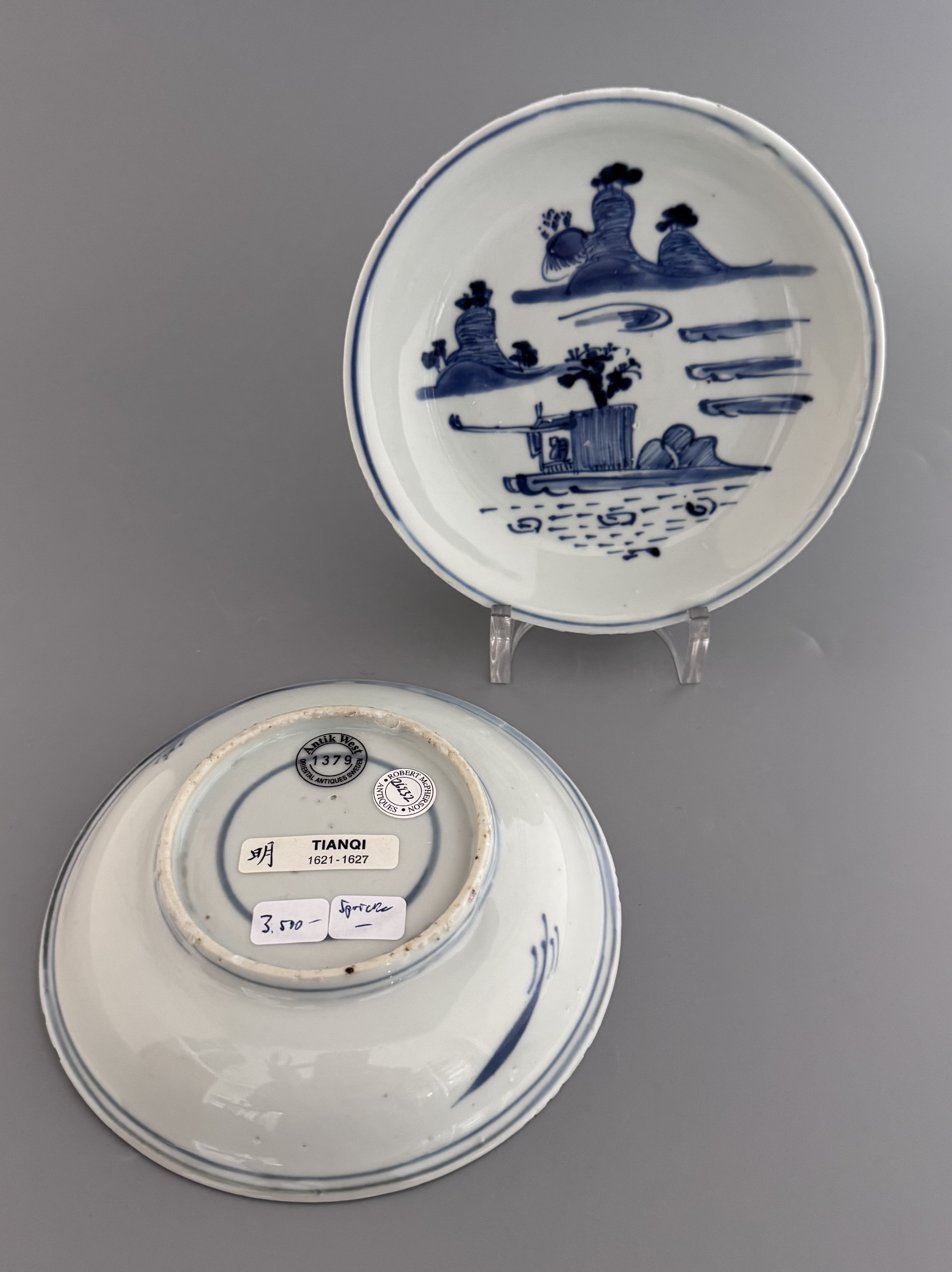 Vackra små fat från Kina, Tianqi 1621-1627. Blå underglasyr med motiv av flodlandskap.