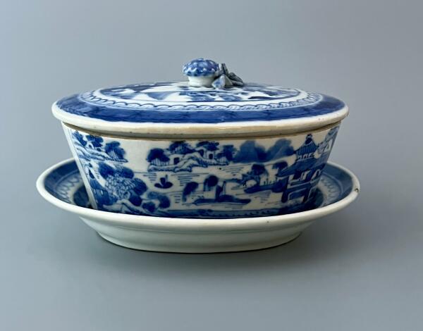 En vacker smörterrin med fat, blå underglasyr. Kina ca 1800.