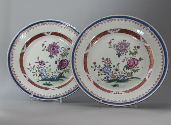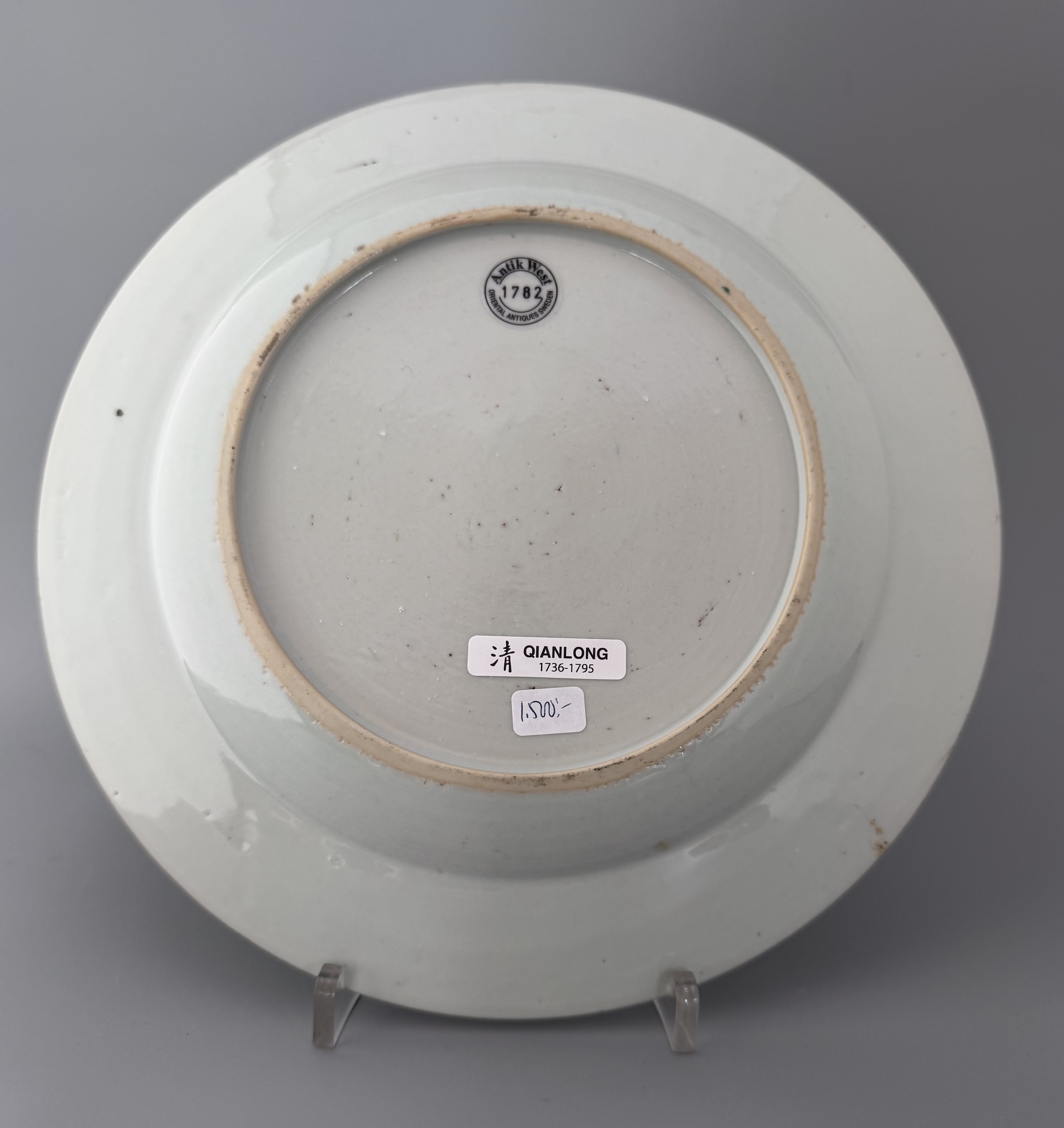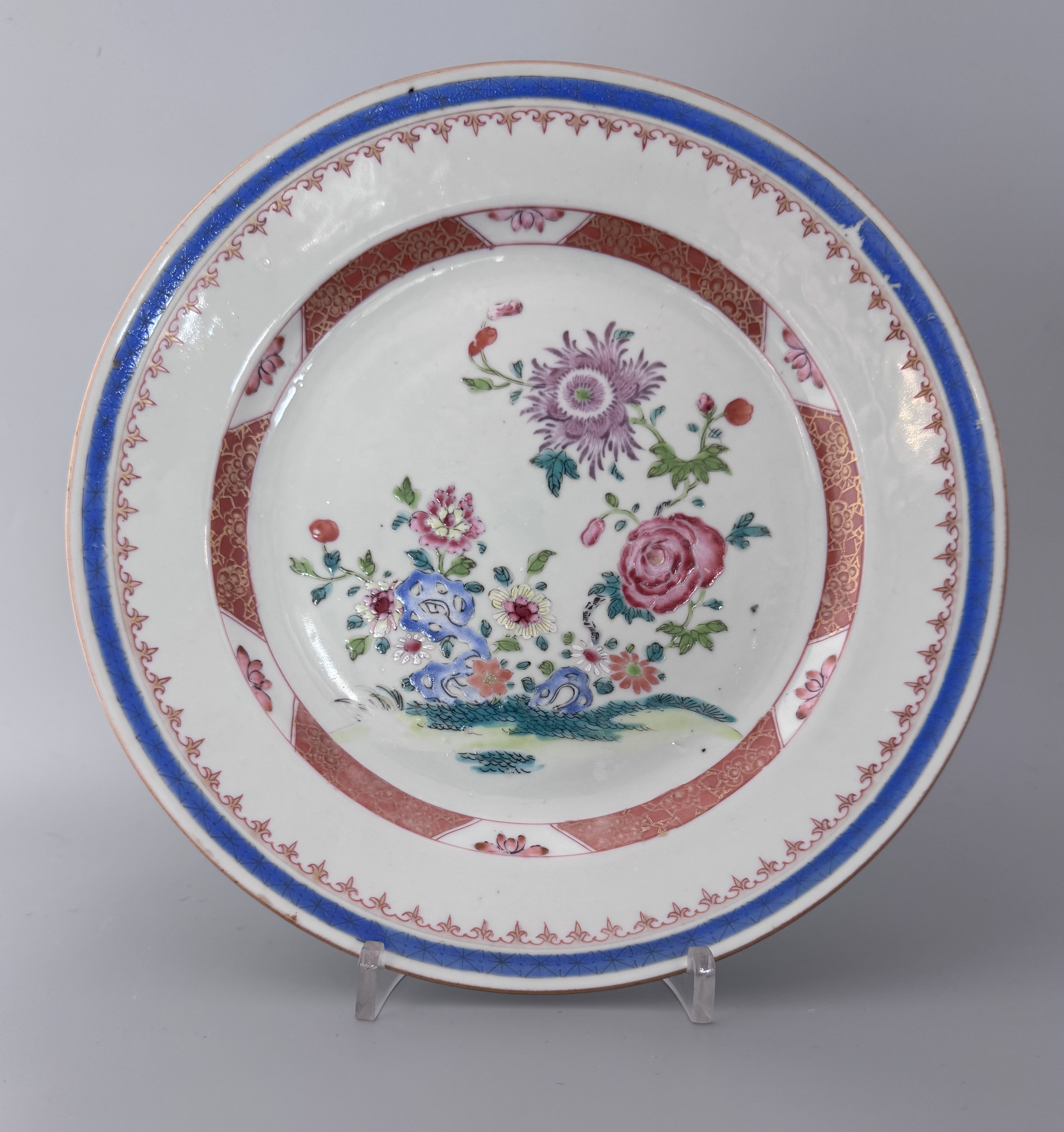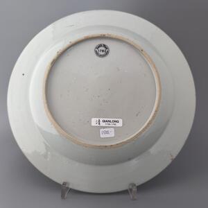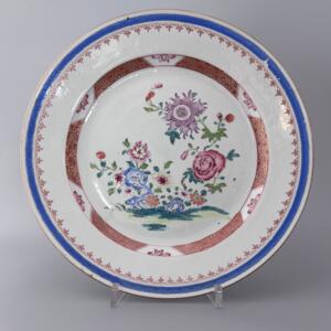 Tallrik med emaljdekor och pionmotiv med rött och blått.