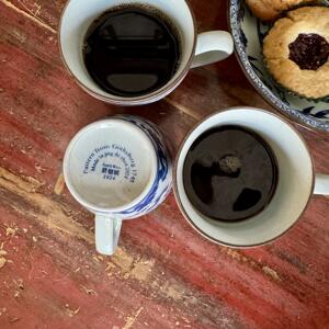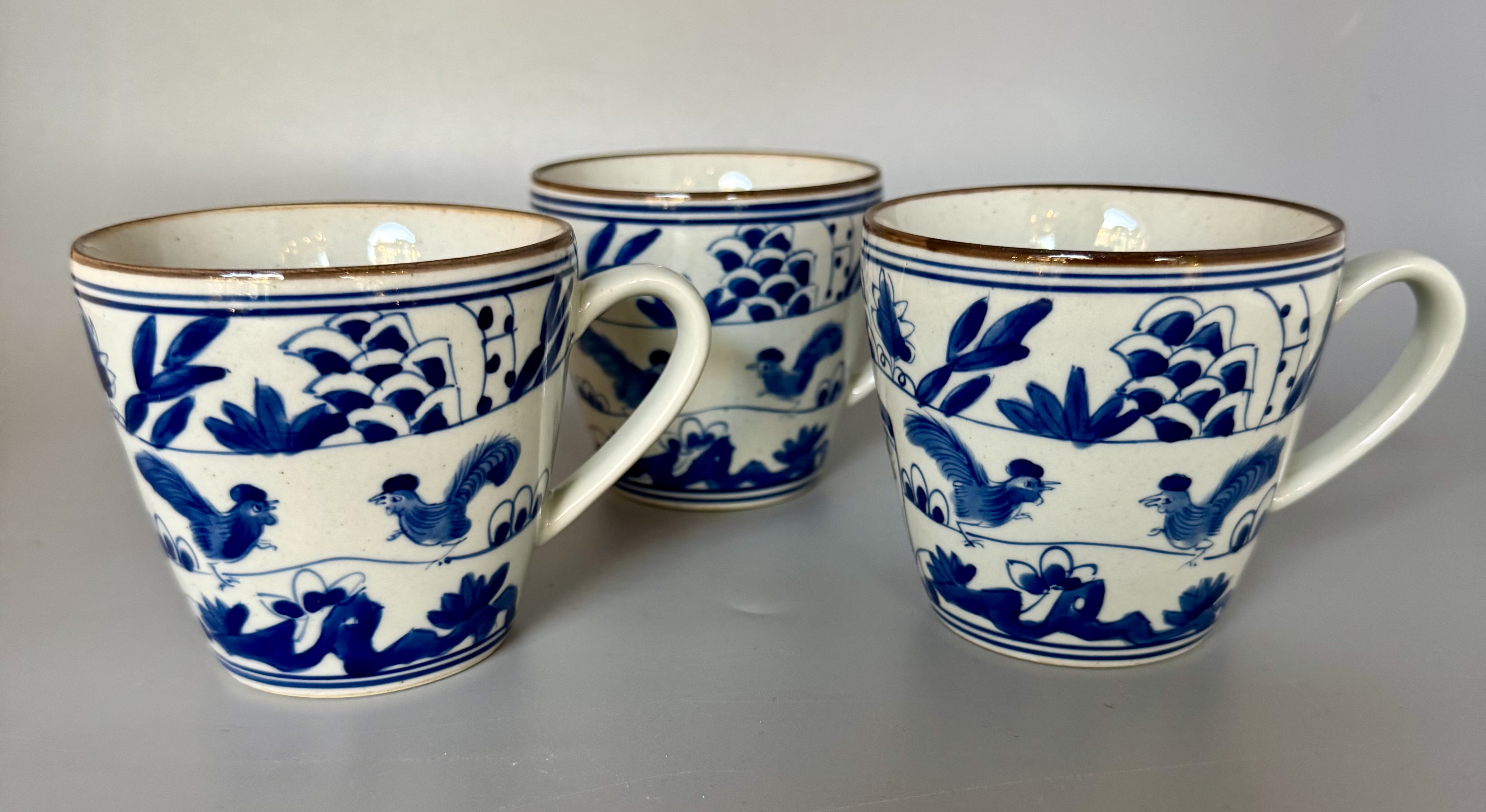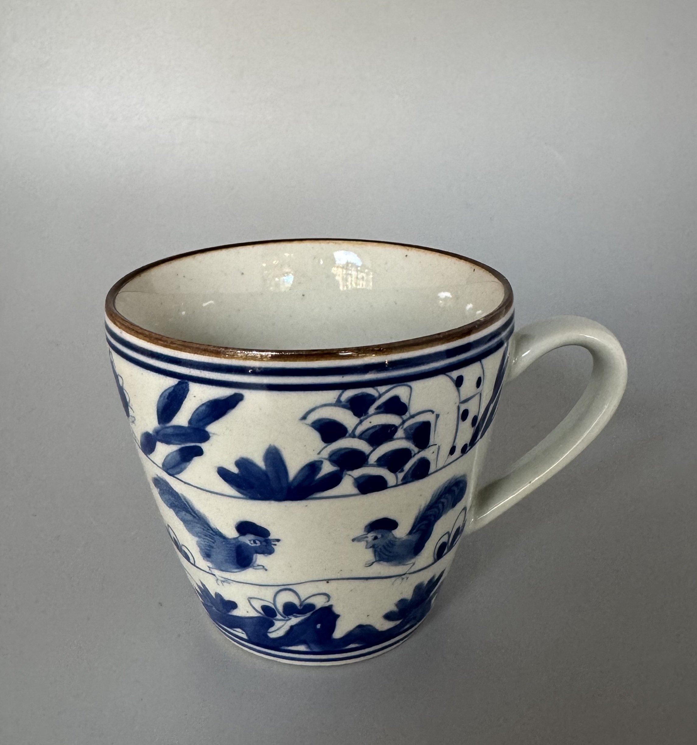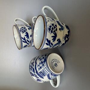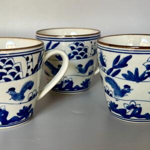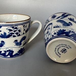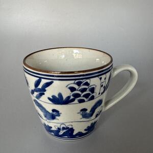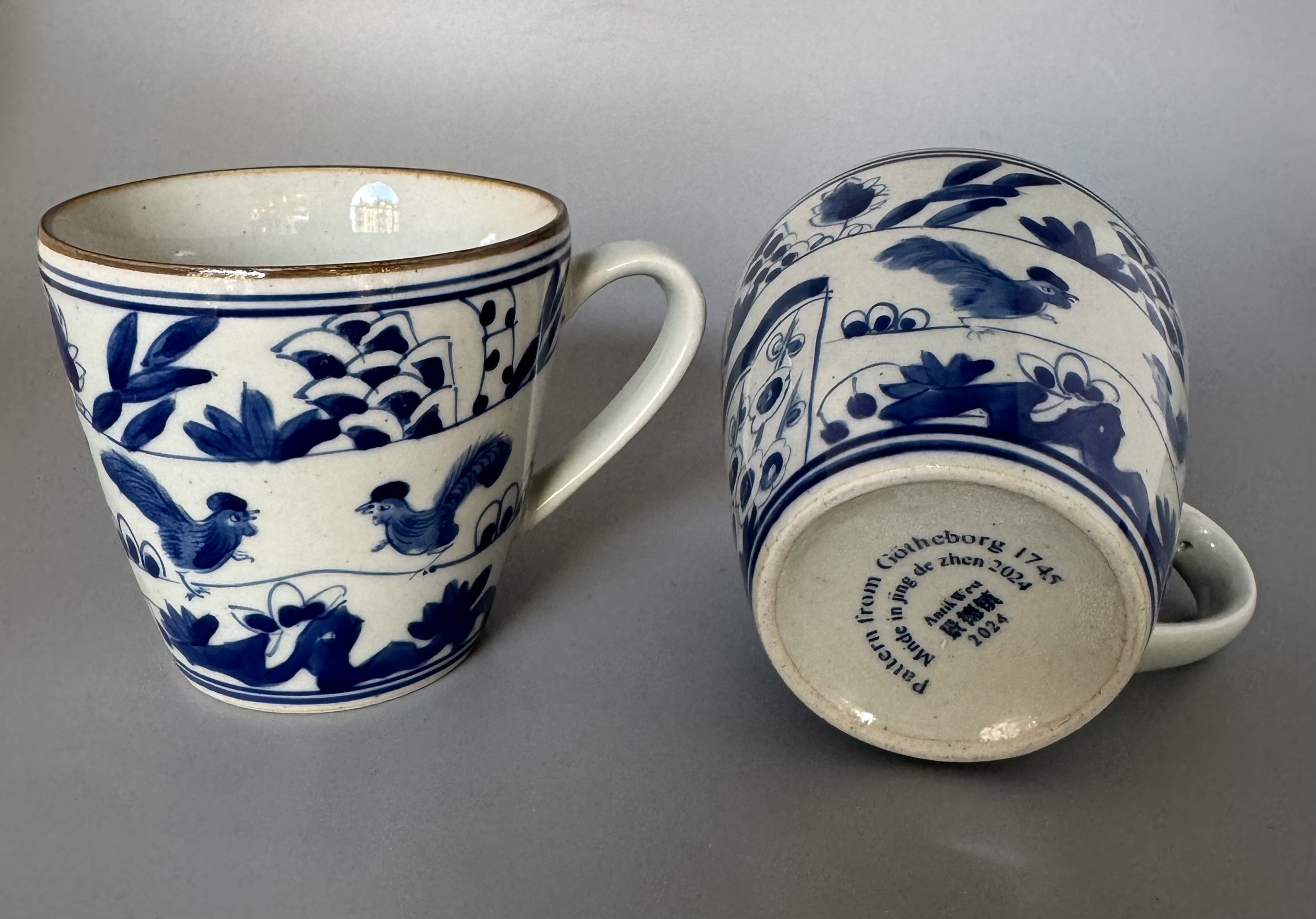 Kaffemugg /tekopp med dekor av tuppar. Handmålad i koboltblått och underglasyr hösten 2024 i Jingdezhen i högsta kvalité.