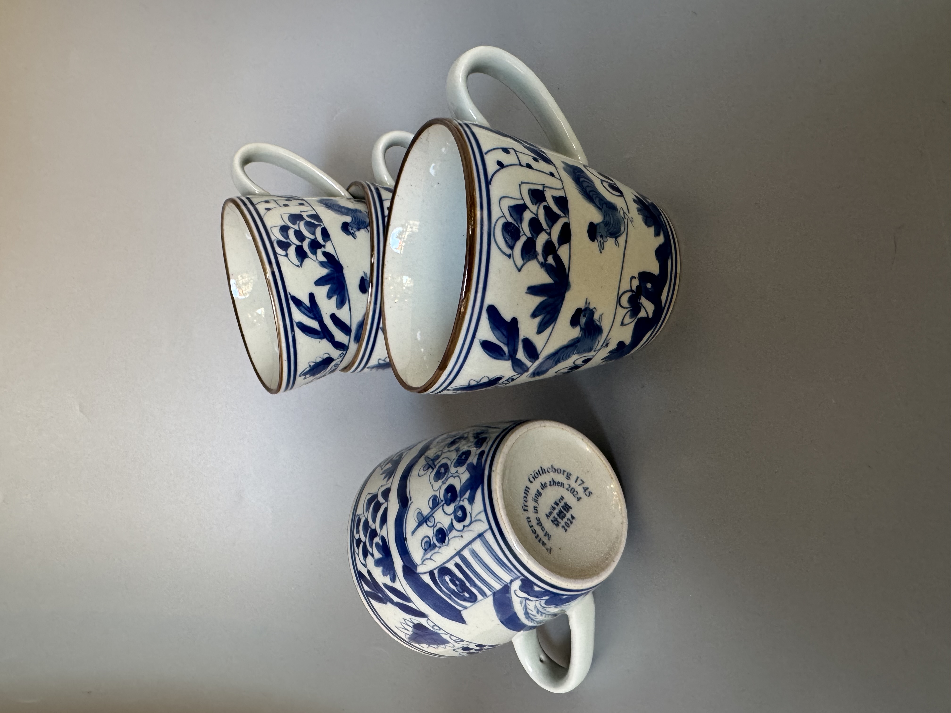 Dekoren med tuppar är framtagen efter förlaga från porslin som fanns på på Ostindiefararen Götheborg som sjönk 1745.