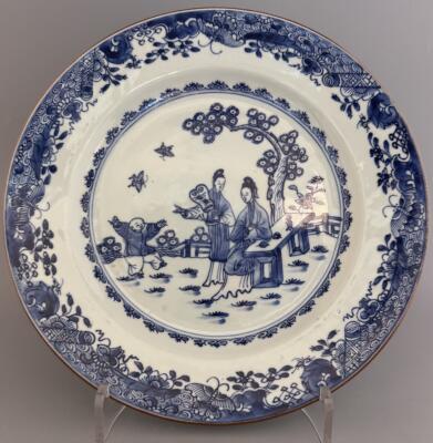 En tallrik med blå underglasyr och dekor av 2 dam...