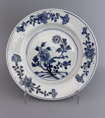 Tallrik med blå underglasyr och dekor av blommor....