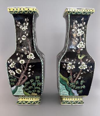 Två vaser med emaljdekor i famille noir stil. Mot...