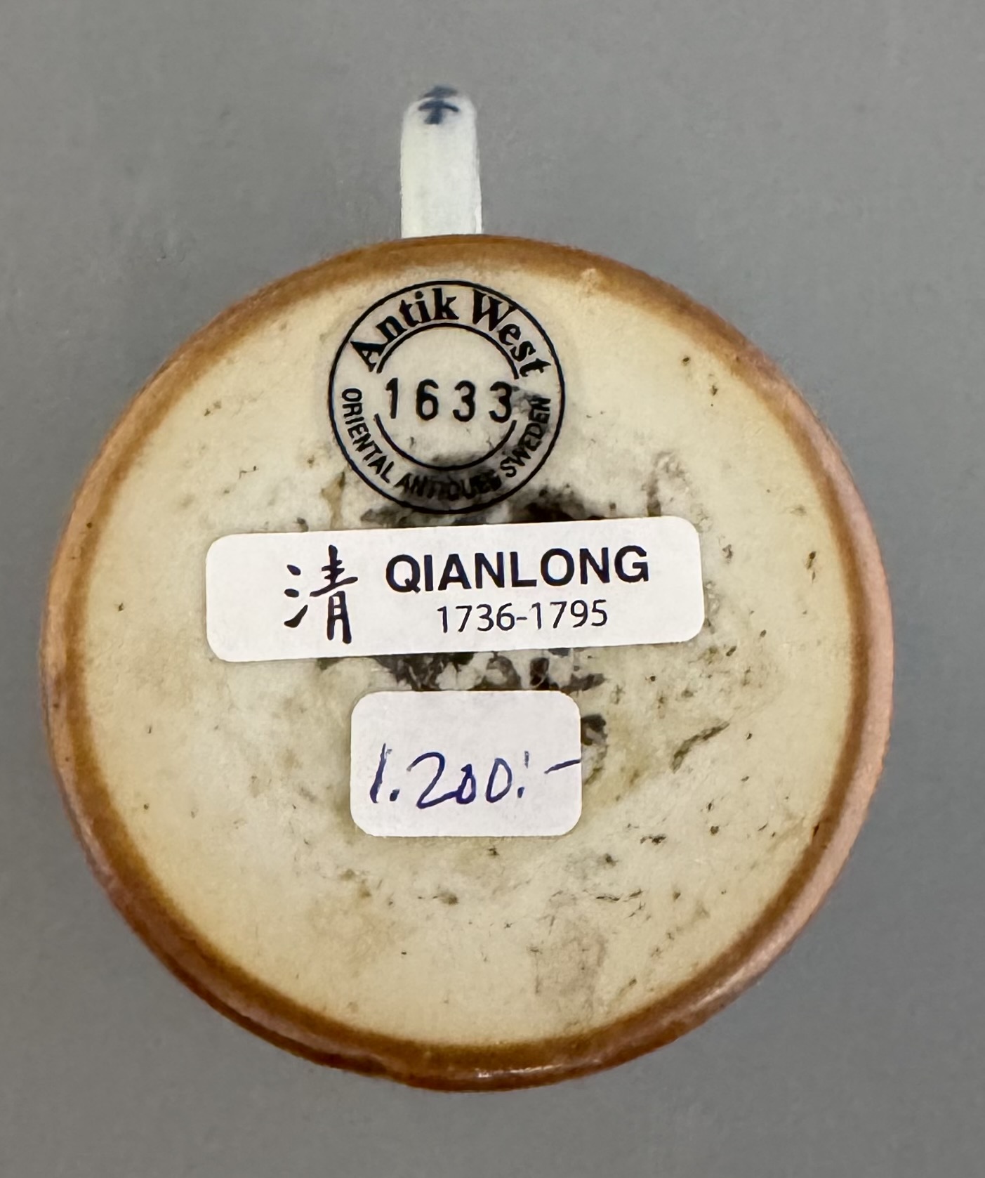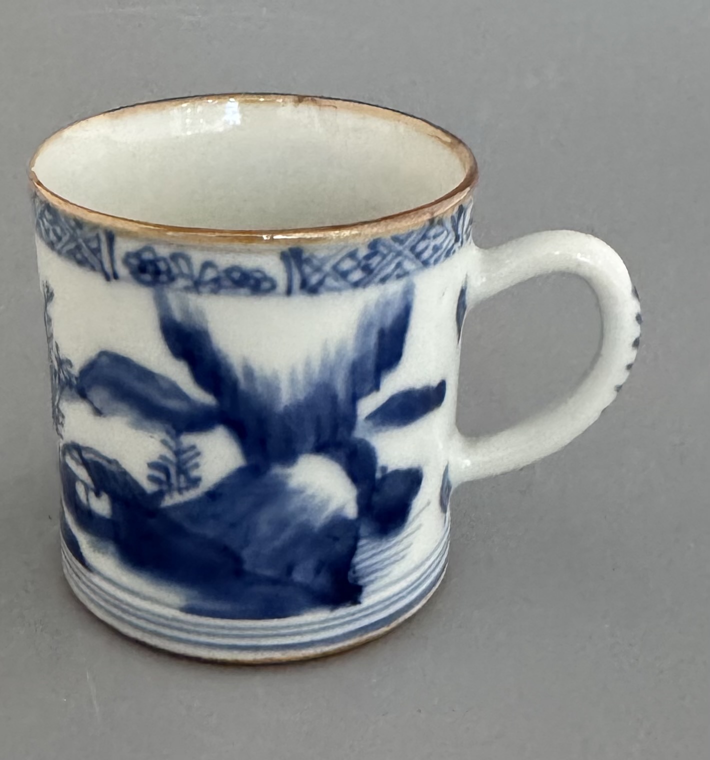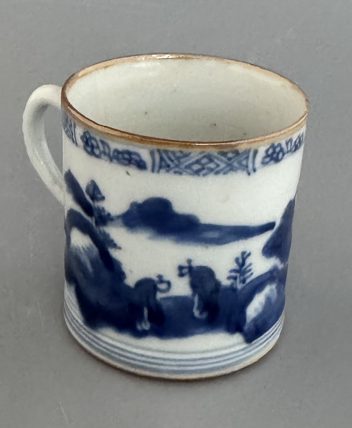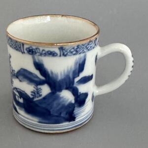 Vacker kopp med blå underglasyr och dekor av landskap. Kina 1700-tal