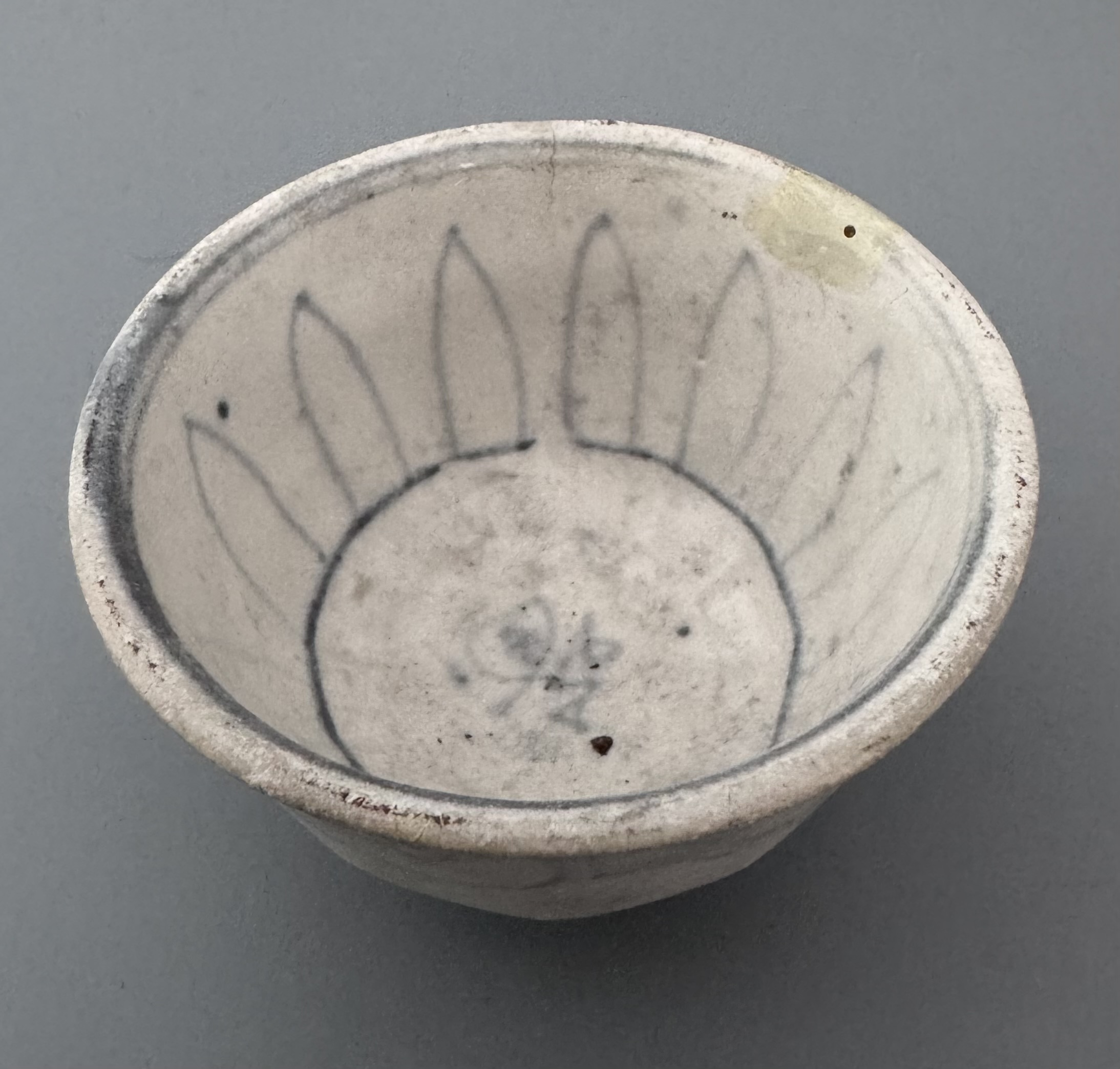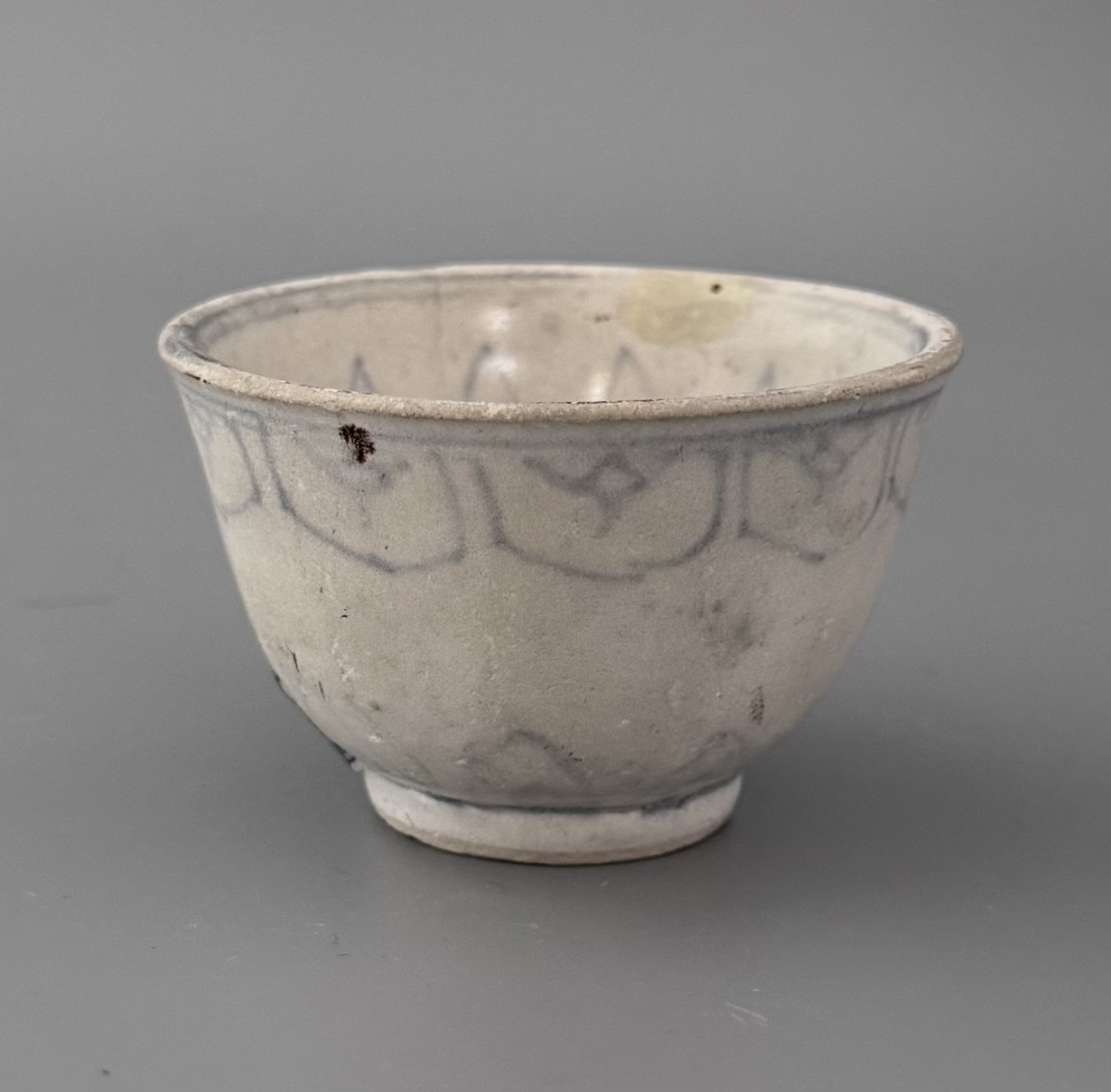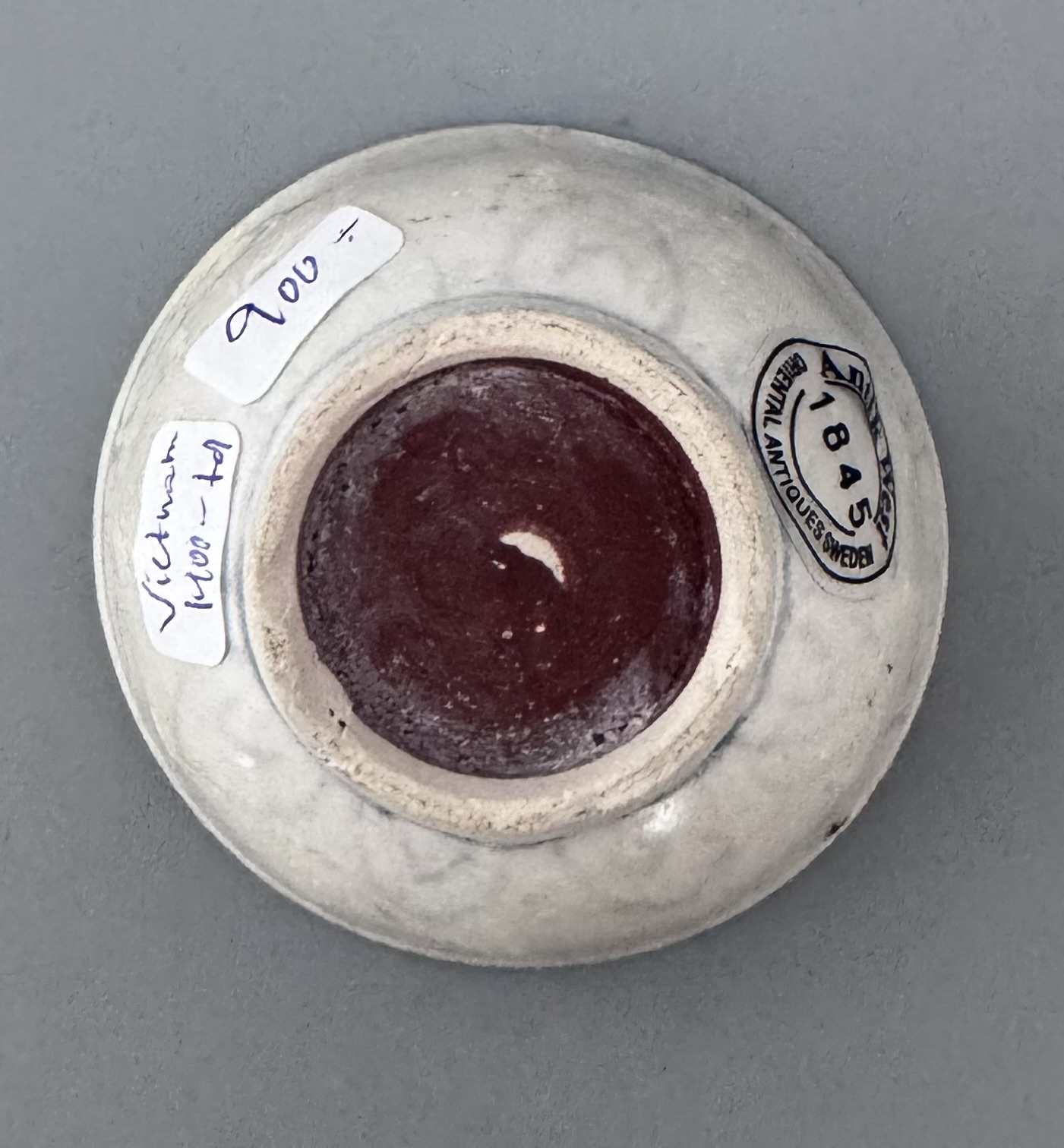 Kopp från Vietnamn med matt blå underglasyr. Brun botten vilket är typskt för porslin från Vietnam.