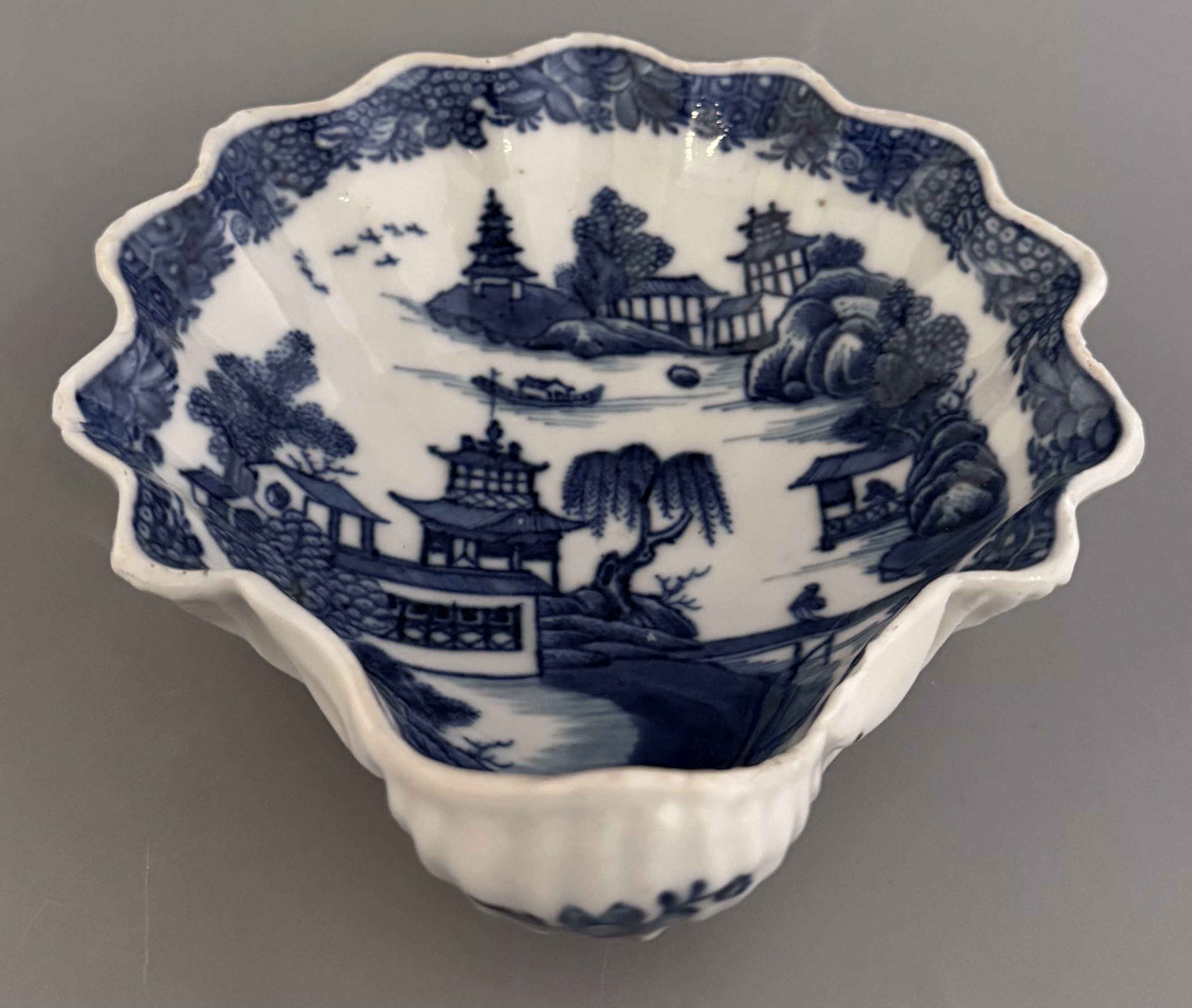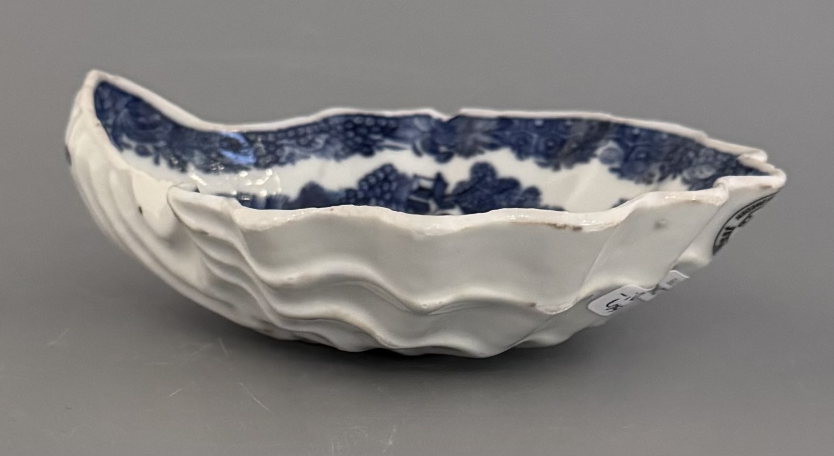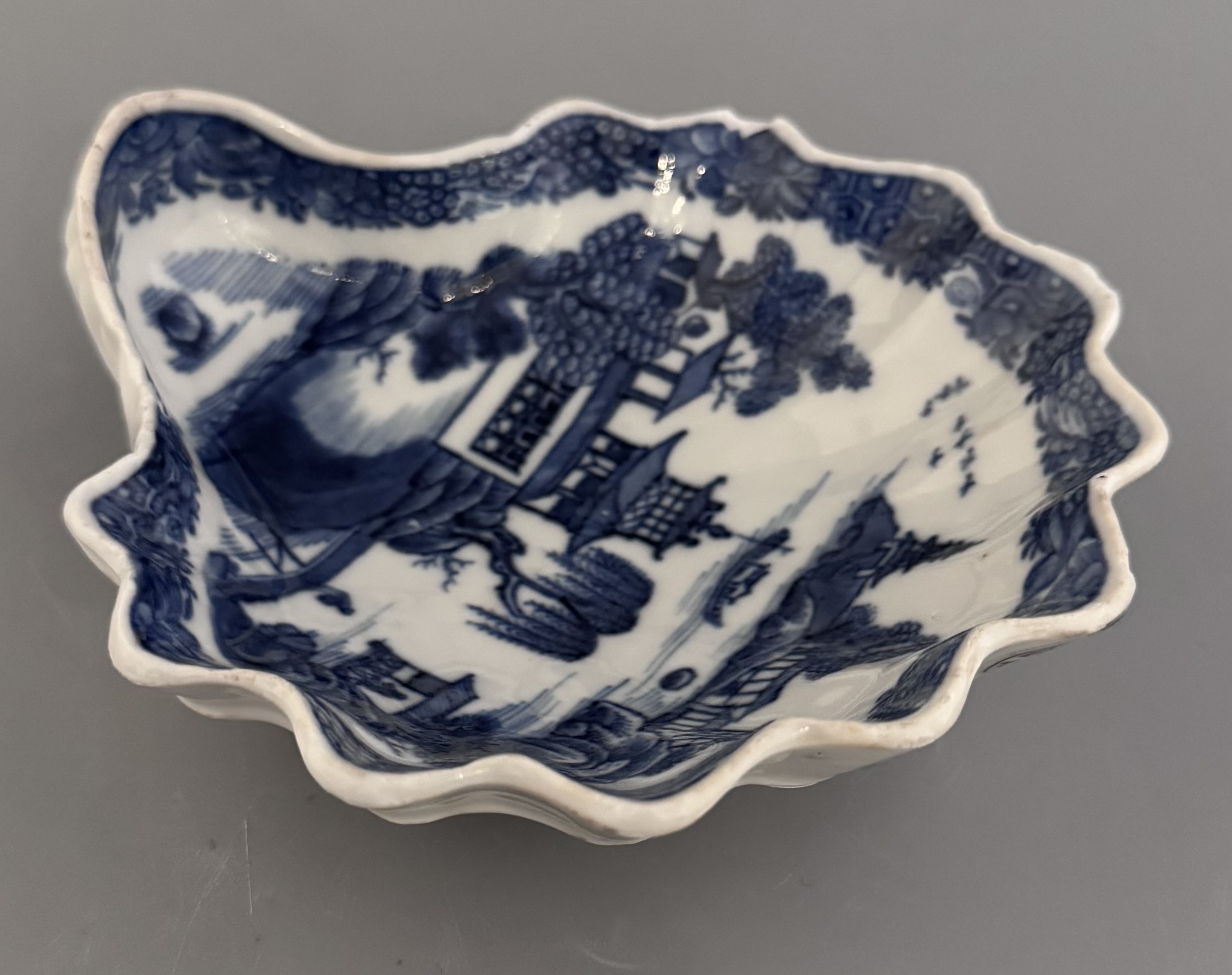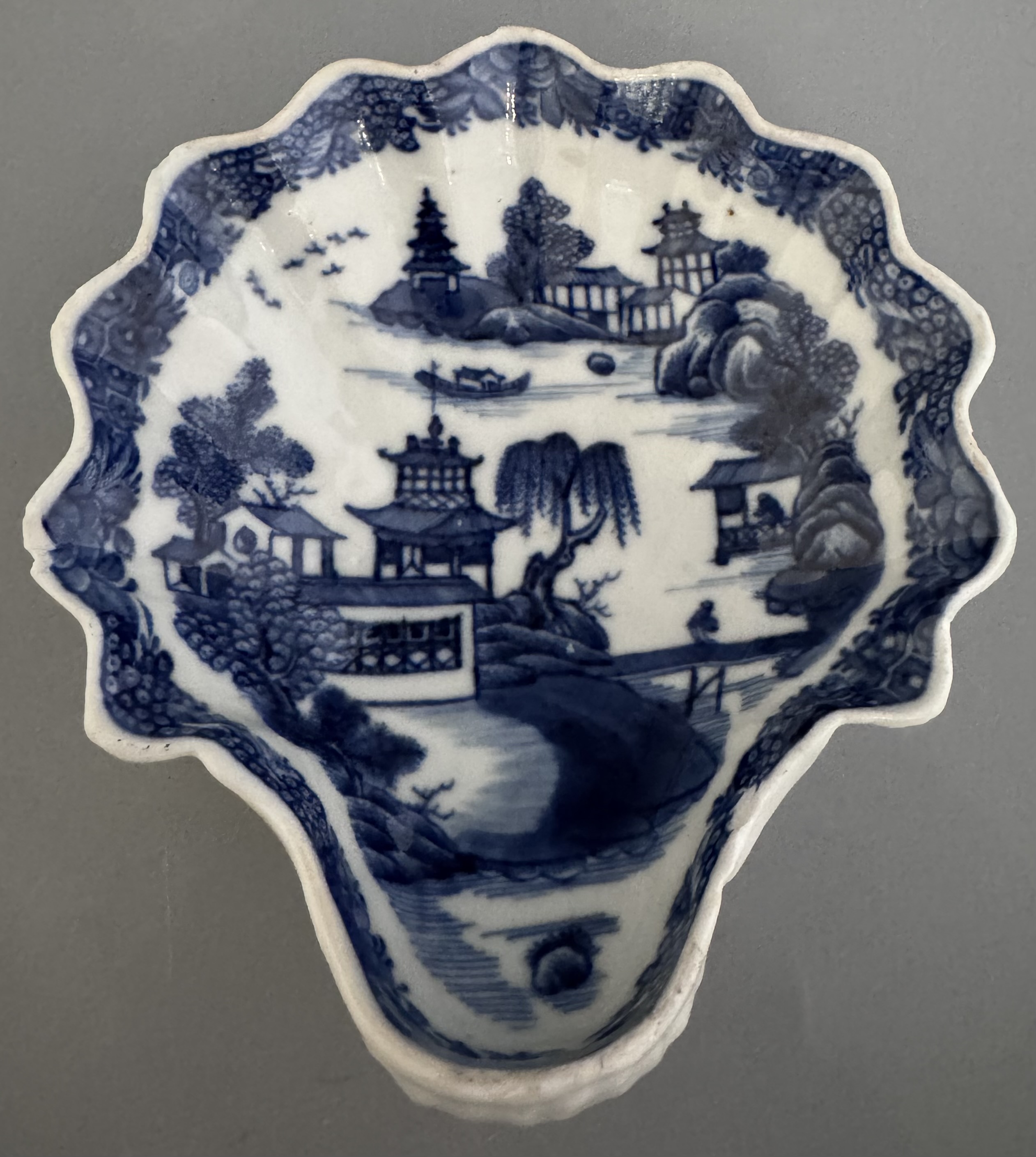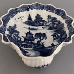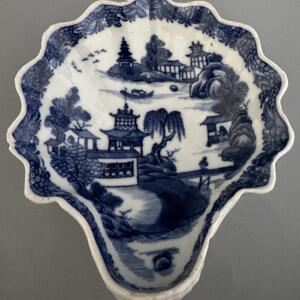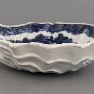 Vacker smörsnäcka med blå underglasyr och dekor av det klassiska Willow motivet, ett av världens mest kända porslinsdekorsmönster. Namnet Willow kommer från tårpilarna i dekorens landskap.