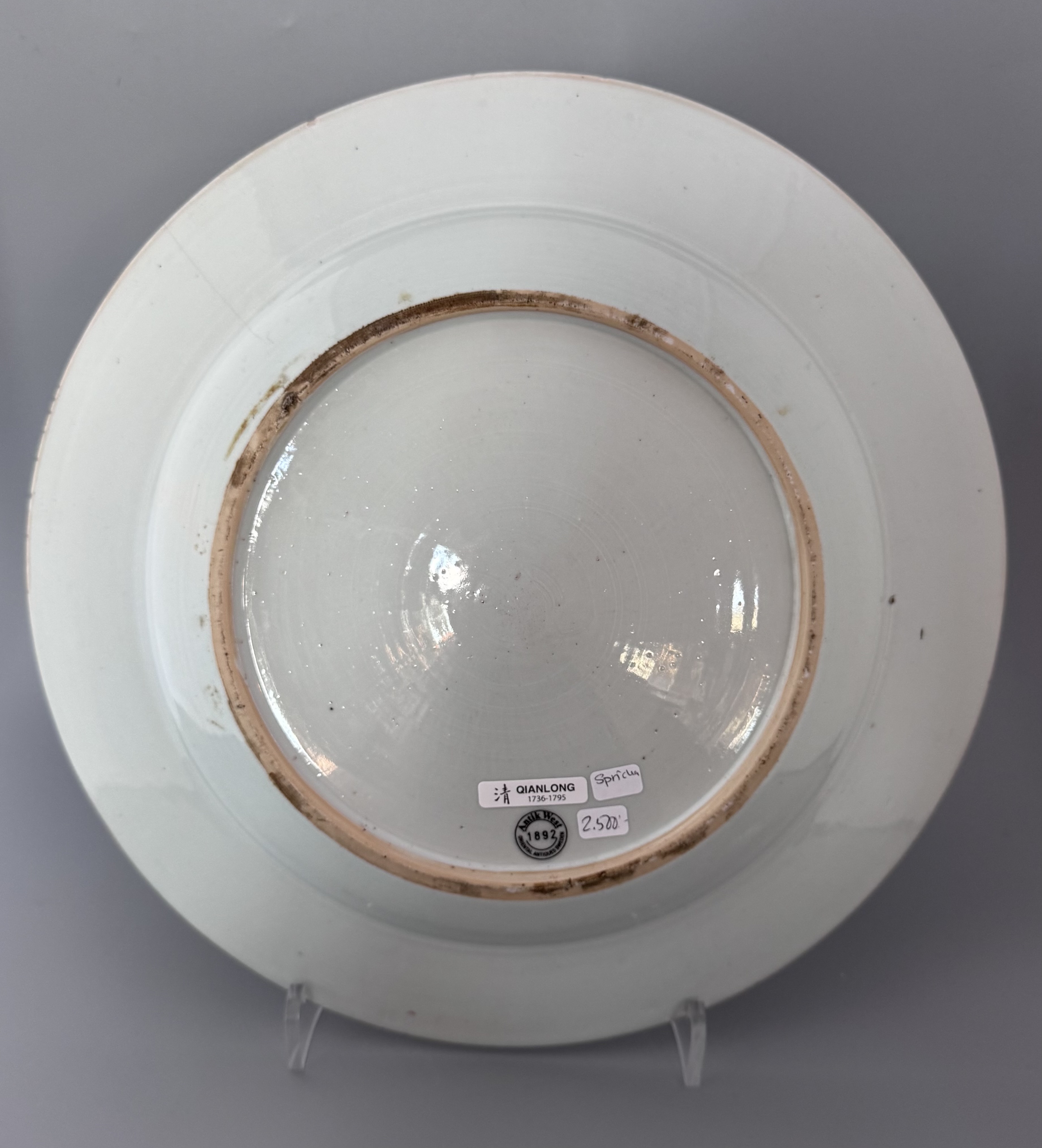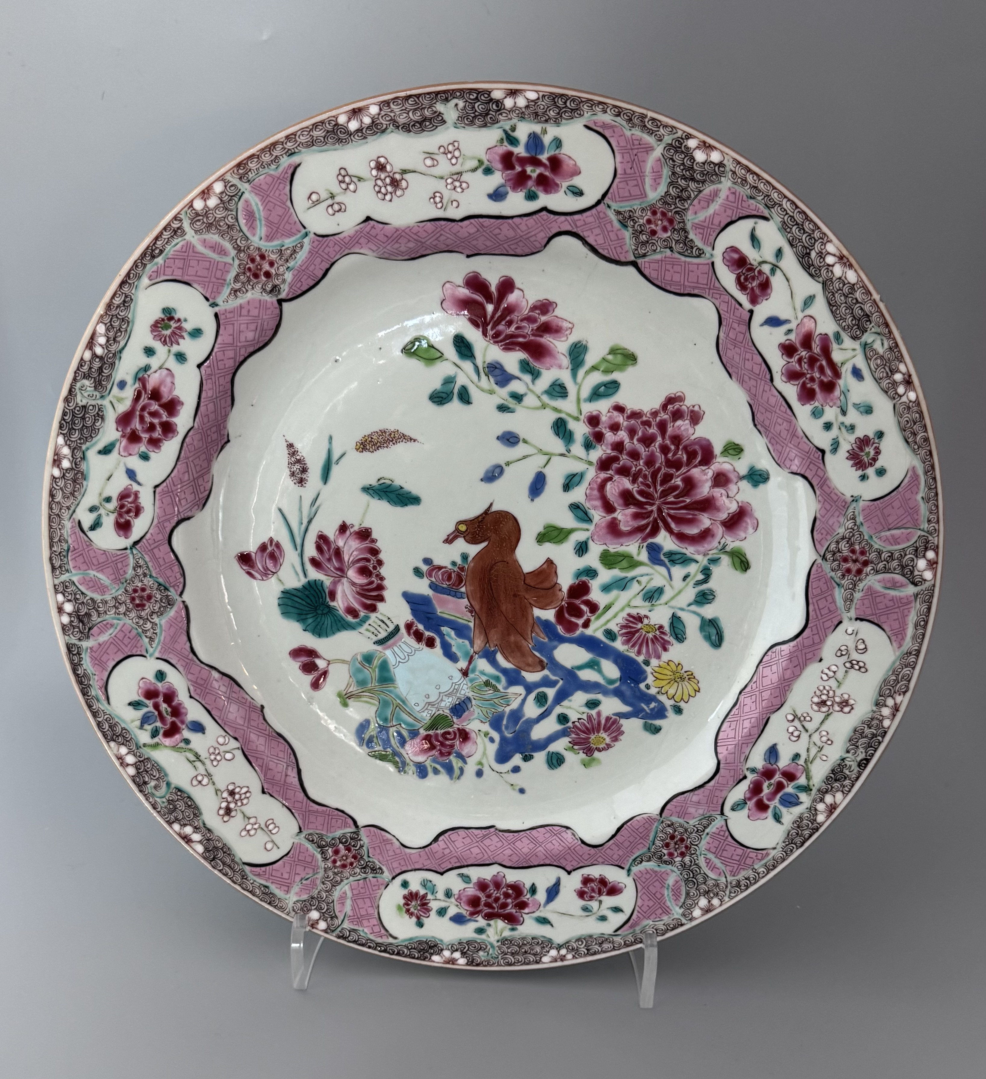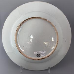 Tallrik med diameter 33 cm, dekor av pion och fågel i famille rose dekor. Kina, ca 1780