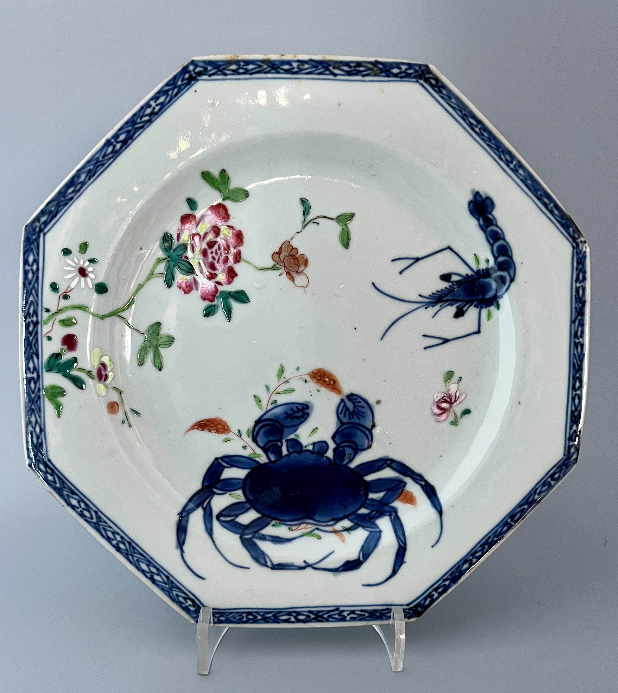 Set med 6 st åttakantiga tallrikar. Blå underglasyr och en mycket ovanlig dekor av krabba och räka. Kina ca 1760
