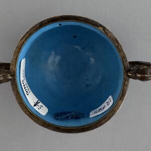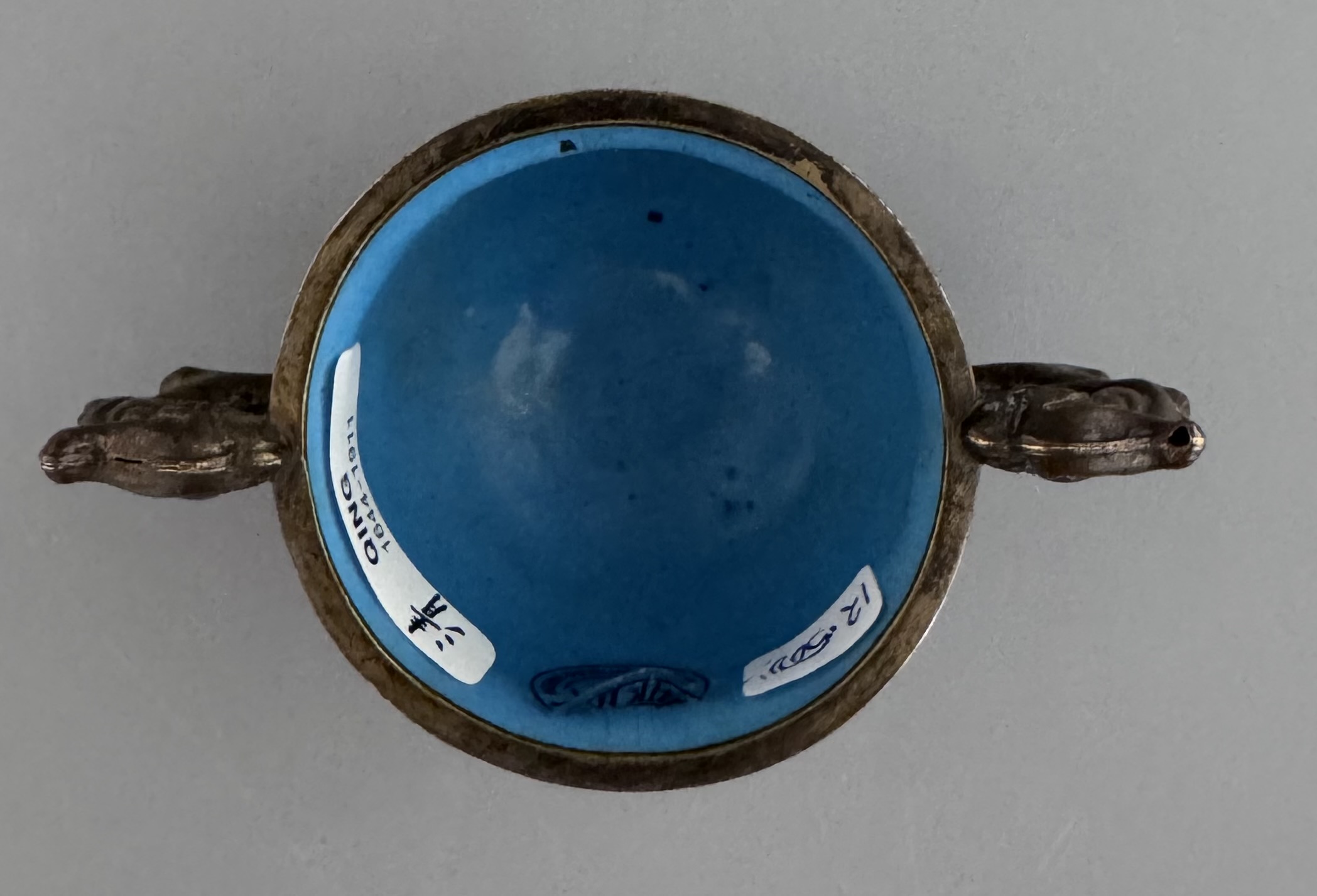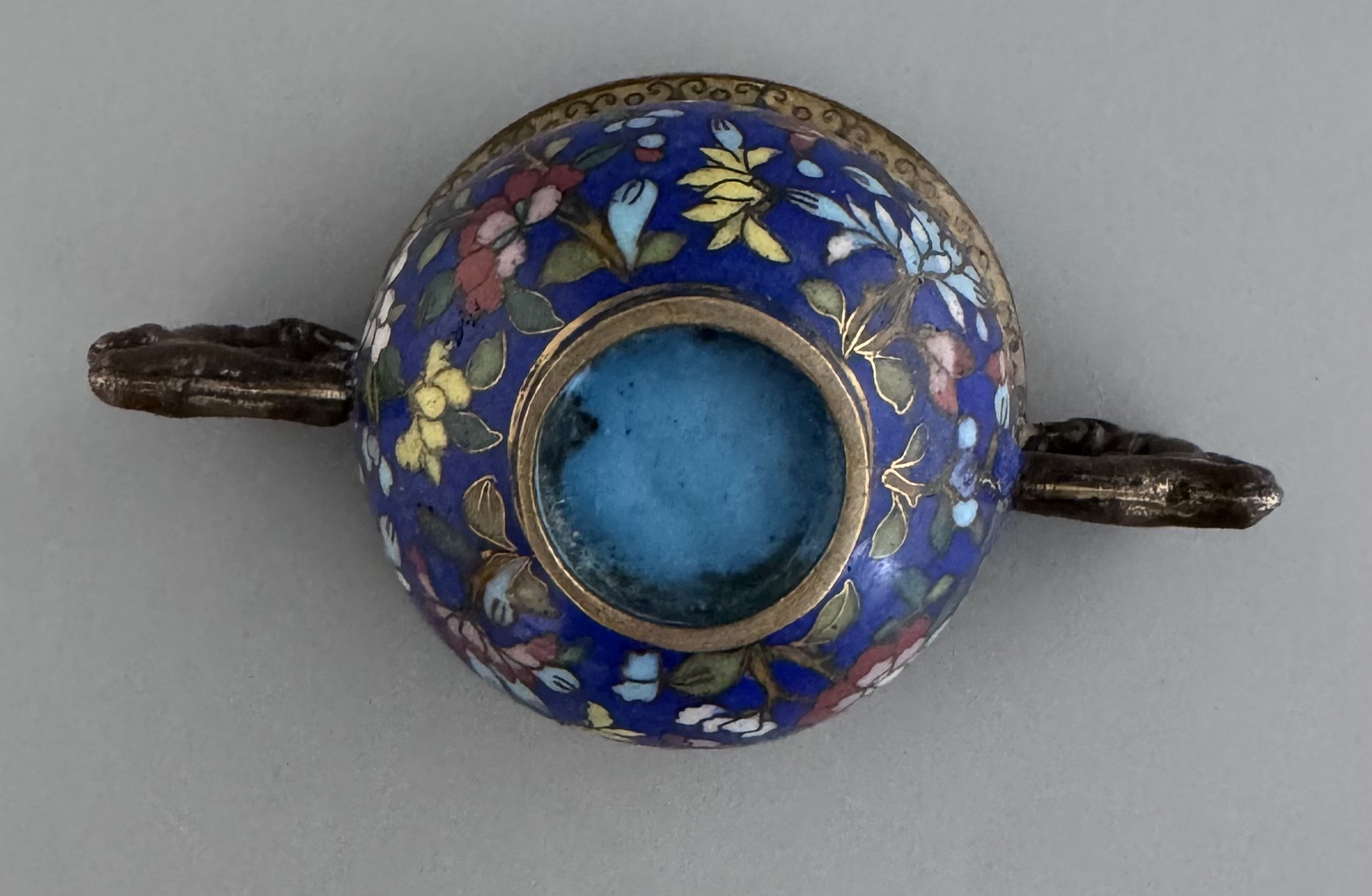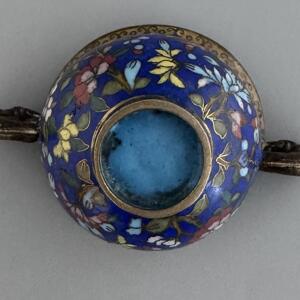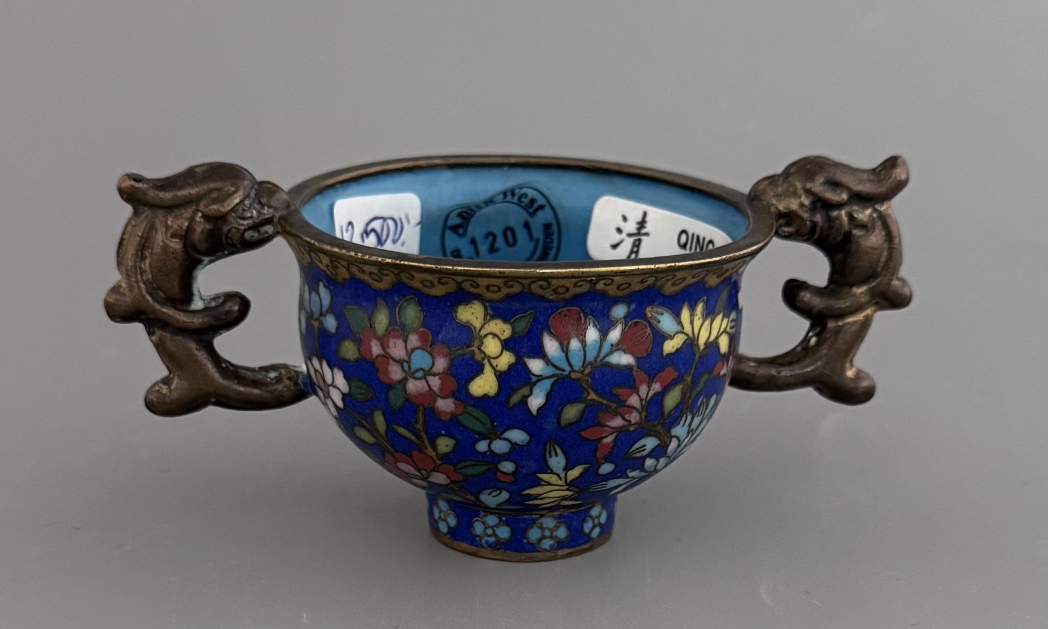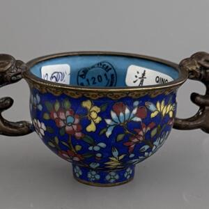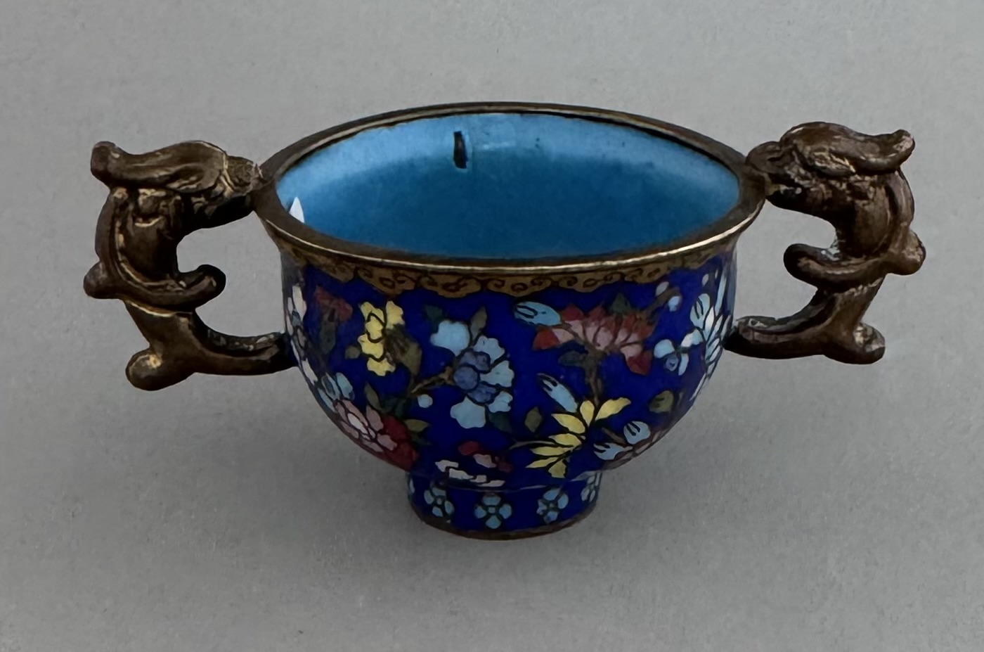 Vinkopp med djurhänklar. Cloissoné med dekor av blommor.